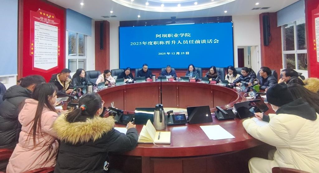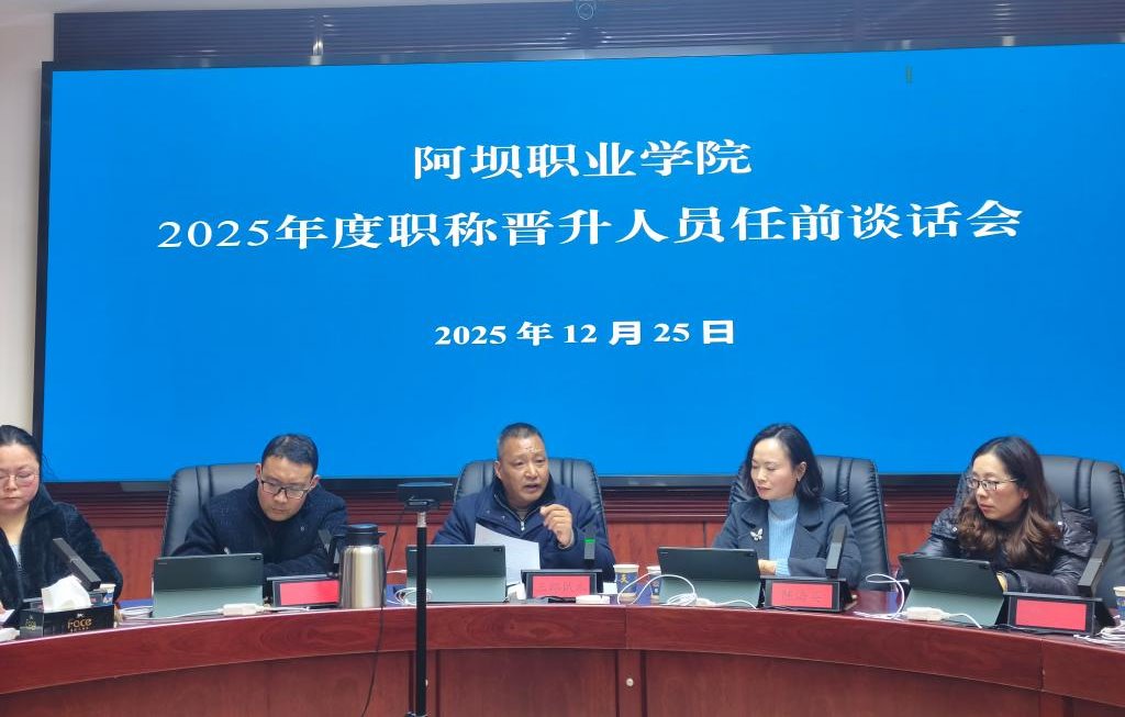 根据学校党委、行政部署安排,12月25日,阿坝职业学院组织召开2025年度职称晋升人员任前集体谈话会。党委副书记、纪委书记三郎俄木出席会议并讲话,中职部主任、组织人事部负责人陈海英主持会议,2025年新晋职称的21名教师参加会议。