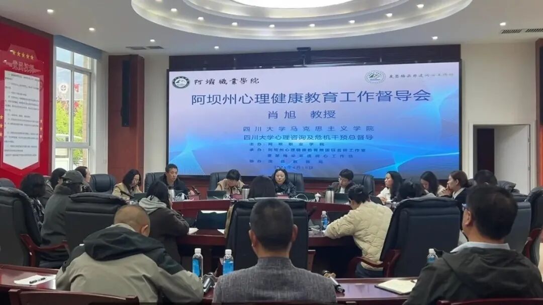 2.4月10日,阿坝州心理健康教育大中小一体化建设工作交流会暨心理工作督导会在党群会议室顺利召开。四川大学马克思主义学院、心理咨询及危机干预总督导肖旭教授,阿坝职业学院党委委员、副院长龙涛,茂县教育局党委委员梁勤友,茂县各中小学心理健康工作分管领导、各学校专兼职心理教师、阿坝州心理健康教育熊国钰名师工作室全体成员参加了会议。