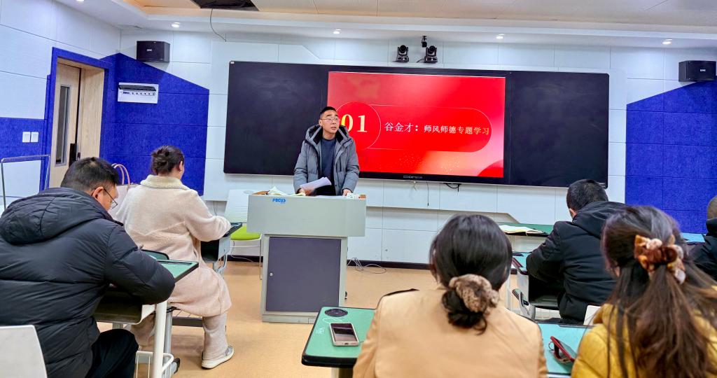 随后,会议进入专题学习环节。部门副部长谷金才领学了关于加强新时代师德师风建设的重要文件及指示精神。他结合教育教学实际,阐述了师德师风建设的极端重要性,要求全体教师坚守育人初心,恪守职业规范,以德立身、以德立学、以德施教,争做新时代“四有”好老师。