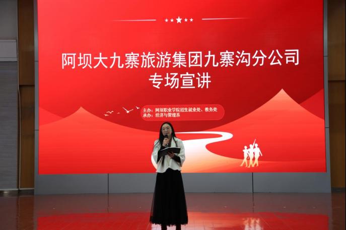 2.4月9日上午,经管系组织23级旅游管理和导游专业学生在学术报告厅参加阿坝大九旅集团九寨沟旅游分公司实习就业专场招聘宣讲活动。本次宣讲会不仅搭建了让学生与企业直接对话的机会,更是为同学们深入了解行业需求和职业方向奠定基础。