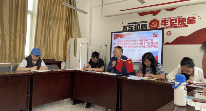 2、9月19日下午,经济与管理系党支部在409会议室召开全体党员大会,会议主题为关于深入贯彻中央八项规定精神学习教育阶段总结暨推进作风建设常态化长效化工作部署。学院党委委员、副书记、副院长蔡鹏飞出席并讲话,提出两点工作要求:一、知敬畏,存戒惧,守底线;二、学精神,强意识,办实事。强调支部所有党员教师要注意言行,把作风建设融入教育教学全过程,以优良党风引领师德师风。