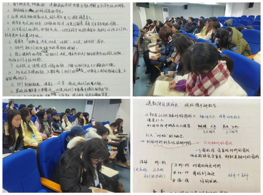 两节课均体现出“以学生为中心”的教学理念,教师通过层次分明的问题链、贴近生活的教学资源以及多元互动方式,将抽象的数学知识转化为可操作、可体验的学习任务。特别是《轴对称图形》一课中融入羌绣纹样的对称分析,《线的认识》拓展环节结合本地交通路线图开展实践探究,展现了数学与地域文化、真实生活的有机融合。观摩过程中,我专业学生专注记录教学环节,不少同学特别关注教师如何通过追问引导思维深化、如何借助评价语言激发学习信心。有学生感慨到:“两节课都留足了学生操作与表达的时间,数学课不再是教师单向讲解,而是成了学生探索与分享的舞台。”