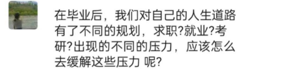 比如,还在应聘选择就业的同学感到的压力,可能是担心自己找不到满意的工作,觉得工作单位要求太高或者各种不适合;选择升学的同学可能是会担心自己在新的学校学习压力会比较大;找到工作的同学可能会认为适应新环境和新生活有点难;
