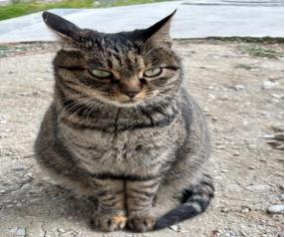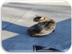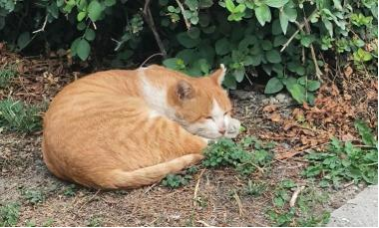 这只流浪猫总是能找到食物和水 源,它的智慧让我惊叹不已。下课出来 看见小猫静静地躺地上,看着同学们, 同学们也都去摸它,特别可爱伸懒腰。