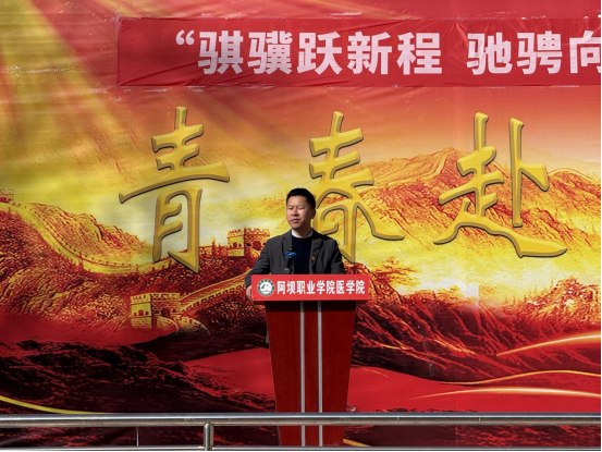 典礼在庄严的升旗仪式中拉开帷幕。马尔康校区党政负责人、医学院院长张世耀致辞,他全面回顾了2025年医学院在党建引领、教育教学、学生管理、产教融合等方面取得的突出成绩:教学运行规范有序,教学资料归档完整率达100%;人才培养质量稳步提升,专升本上线率73%,护考通过率69.34%;产教融合持续深化,新增实践教学基地7家,“智慧健康养老服务与管理”高职专业成功获批;学生活动亮点纷呈,爱老敬老活动登上央视新闻,救护员培训考证率100%,资助工作精准落实,校园安全实现“零事故”。