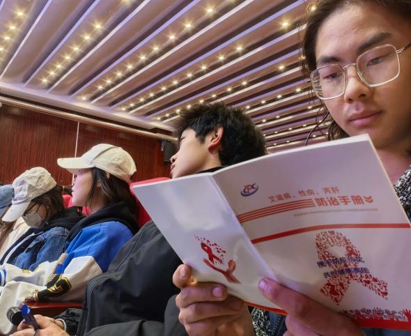知识讲座以学生“阅览防艾宣传手册---防艾视频关看---防艾宣传墙签名--艾滋病知识讲解”为脉络,整个讲座课堂活跃,学生参与度高。讲座结束工作人员还为学生发放了印有防艾知识的小礼品(书皮、手机支架等)。