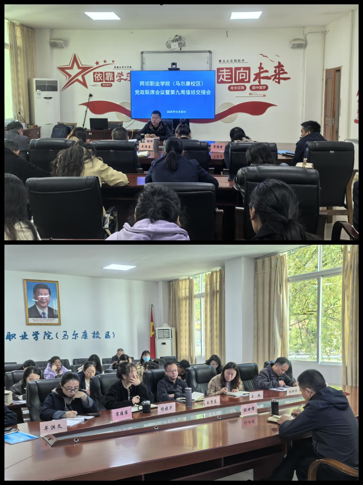 2025年10月20日上午,马尔康校区召开党政联席会,会上认真学习传达了10月16日全校教师干部大会上州委常委、组织部长李昱隆部长的讲话精神及10月17日学院党委第16次党委(扩大)会东周书记提出的“七个聚焦、七项重点工作、四讲”要求,结合马尔康校区实际,提出八个方面的具体工作部署。